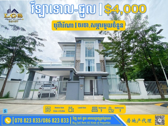 7BED SINGLE VILLA CORNER FOR RENT AT BOREY VIMEAN PP-FULLY FURNISHED